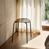 A gently curved seat paired with slender steel legs gives this stool an airy, open profile. Constructed from form-pressed veneer and bent steel tubing, it is offered in several natural wood finishes. Its stackable structure allows up to ten units to be stored vertically, making it a practical choice for both everyday use and flexible arrangements.