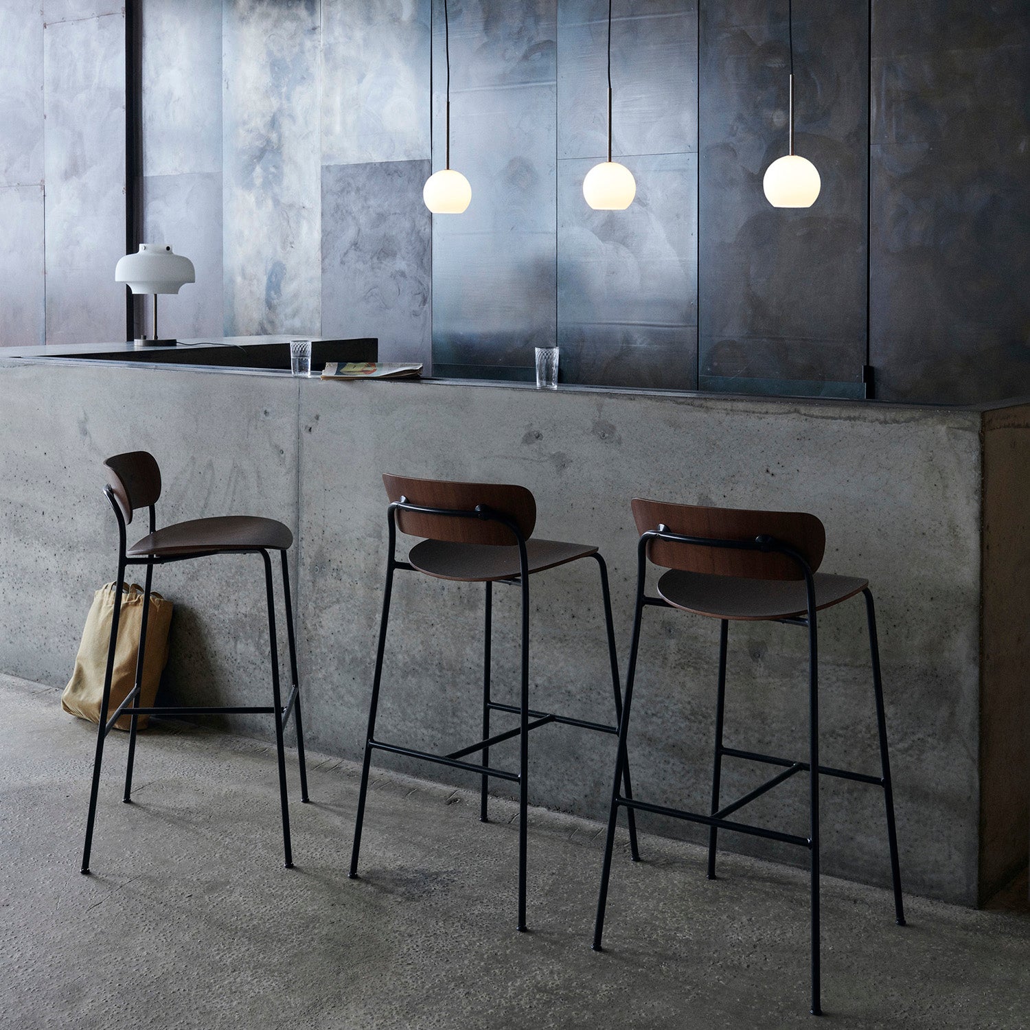 Pavilion seating from Copenhagen's &Tradition easily translates into a barstool, with its fluid curves and lightly scaled presence. Oslo-based design duo Anderssen & Voll base the seating on a framework of industrial steel tubing, elevated with a black powder-coat finish. The gently contoured seat and backrest in wood veneer are as pleasing to the eye as they are agreeably comfortable. Apropos for both residential decor as well as hospitality spaces such as a restaurant or bar.