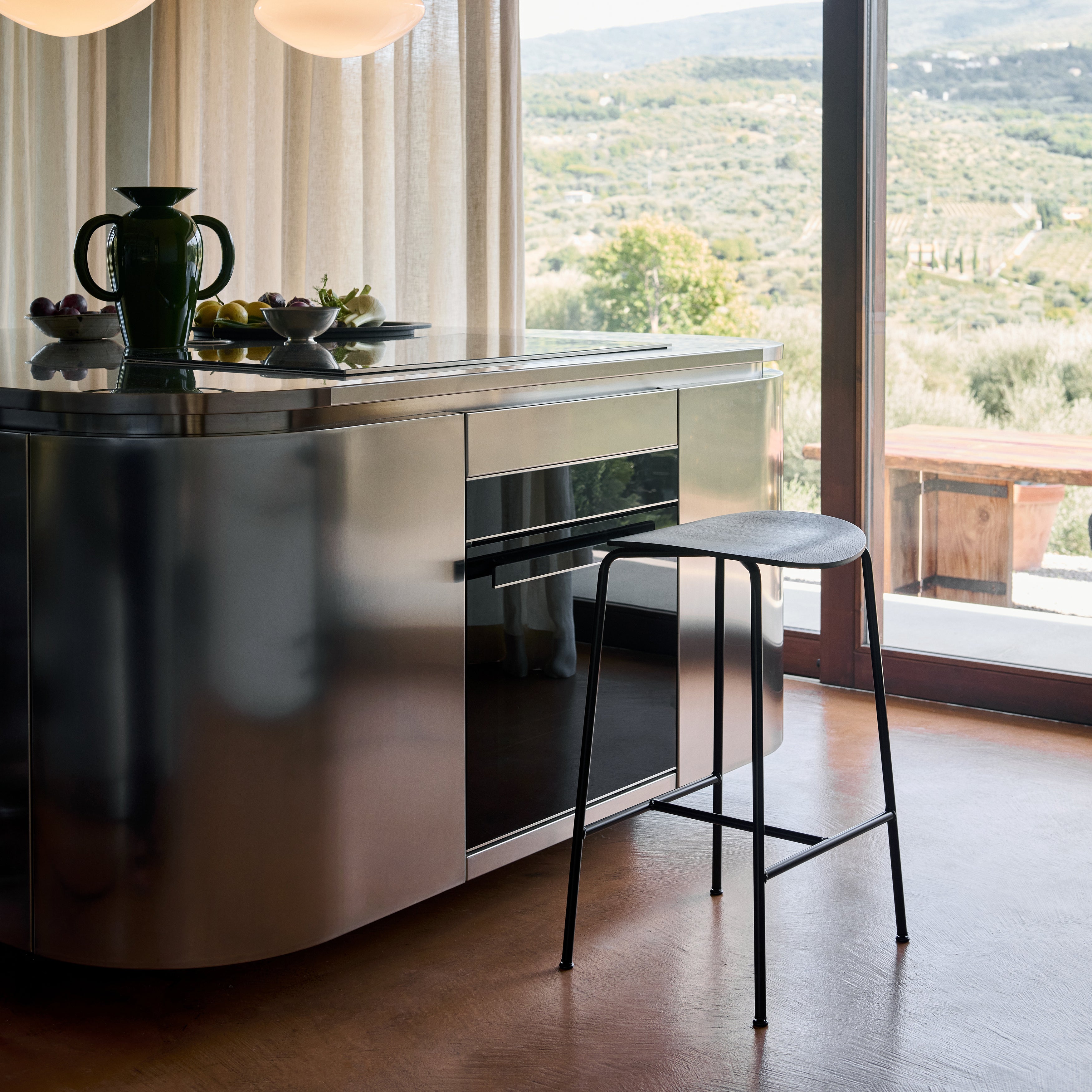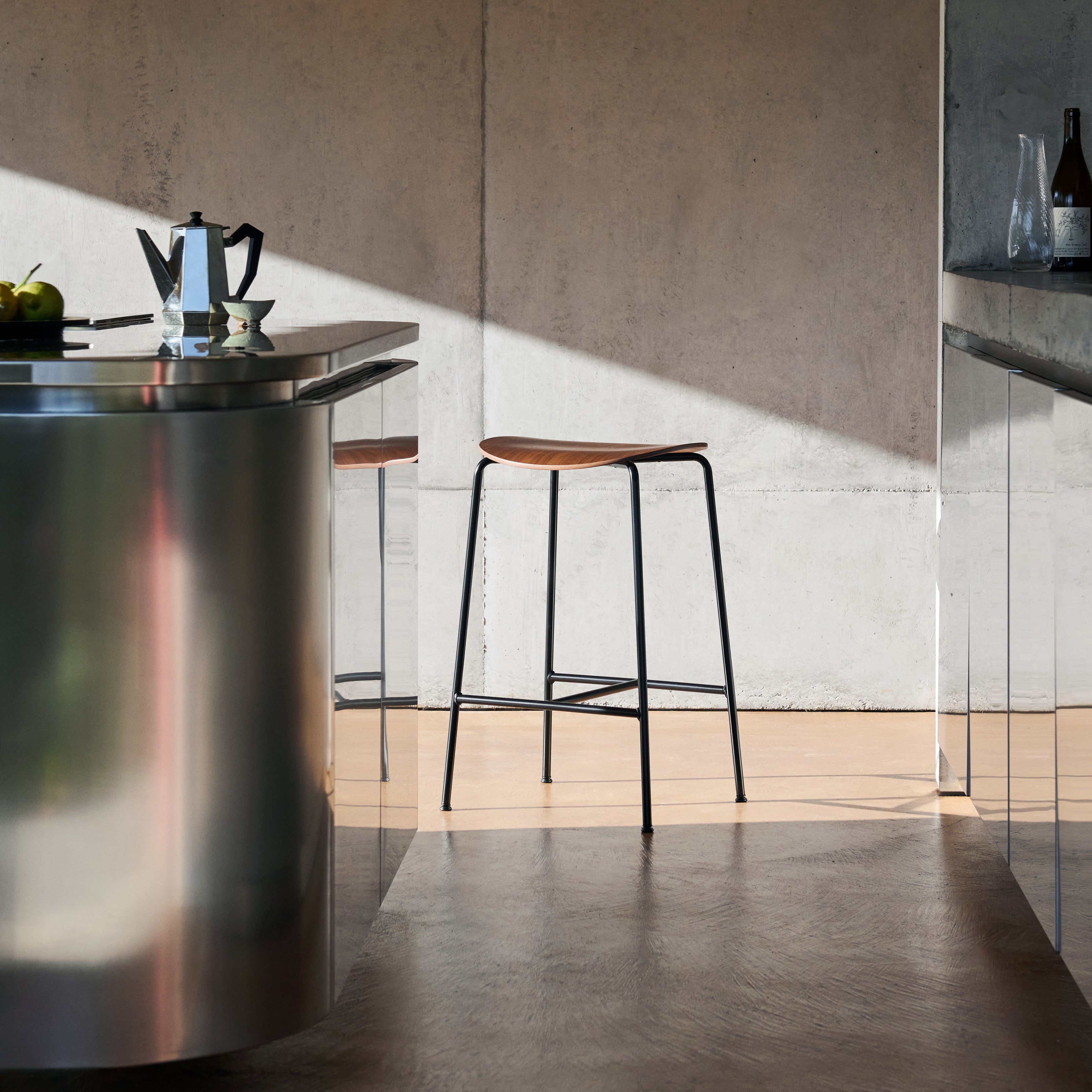 Defined by fluid curves and a slender steel frame. The seat and backrest are crafted from form-pressed veneer, available in finishes lacquered oak, black lacquered oak, and lacquered walnut. Offered in two heights, it integrates easily into various seating arrangements.