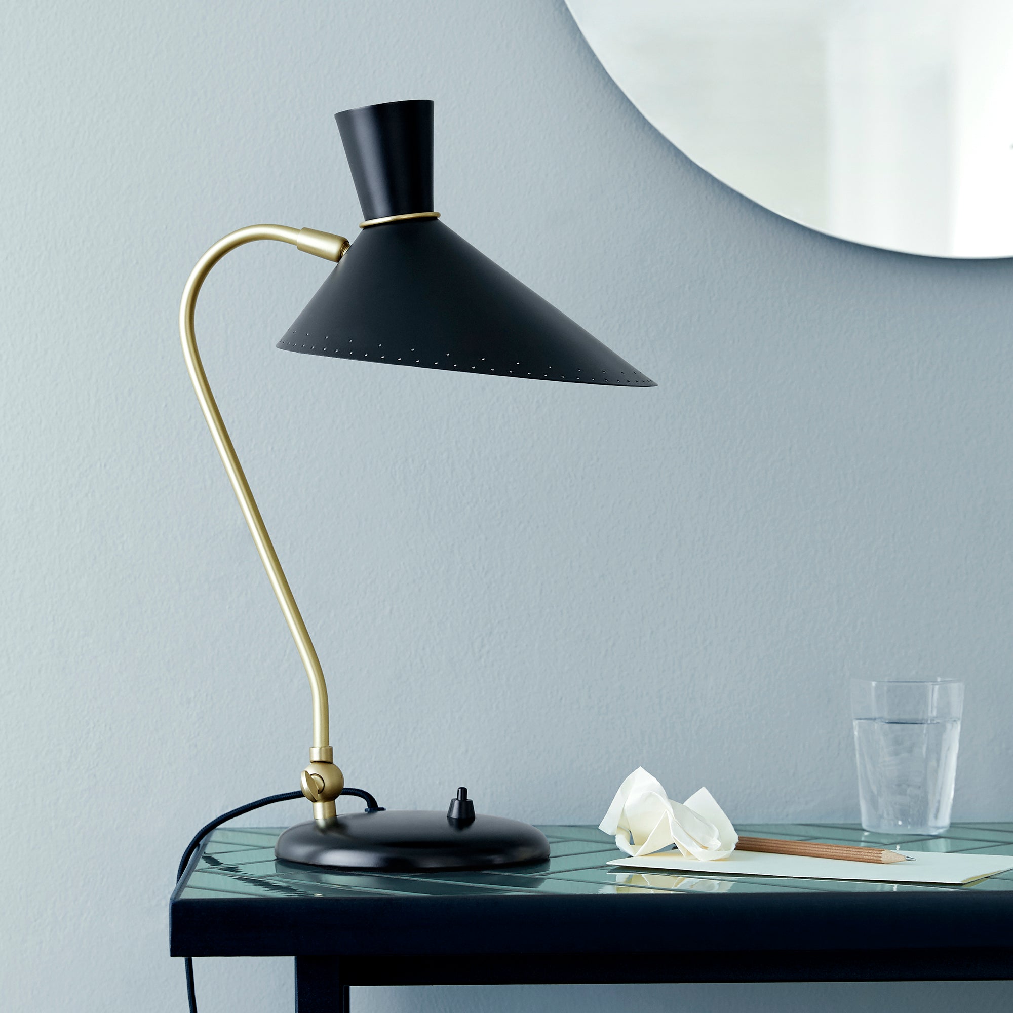 The Bloom Table Lamp, a reissue of Svend Aage Holm-Sørensen's 1950s design, features a conical shade with vertical grooves along its edge, delivering direct and ambient illumination. Its design includes a brass stem, a string switch, and a cone-shaped top, creating a playful yet refined look. Available in 2 colors, each with a silky matte finish. This makes it suitable for both practical lighting and as a decorative piece in living areas.