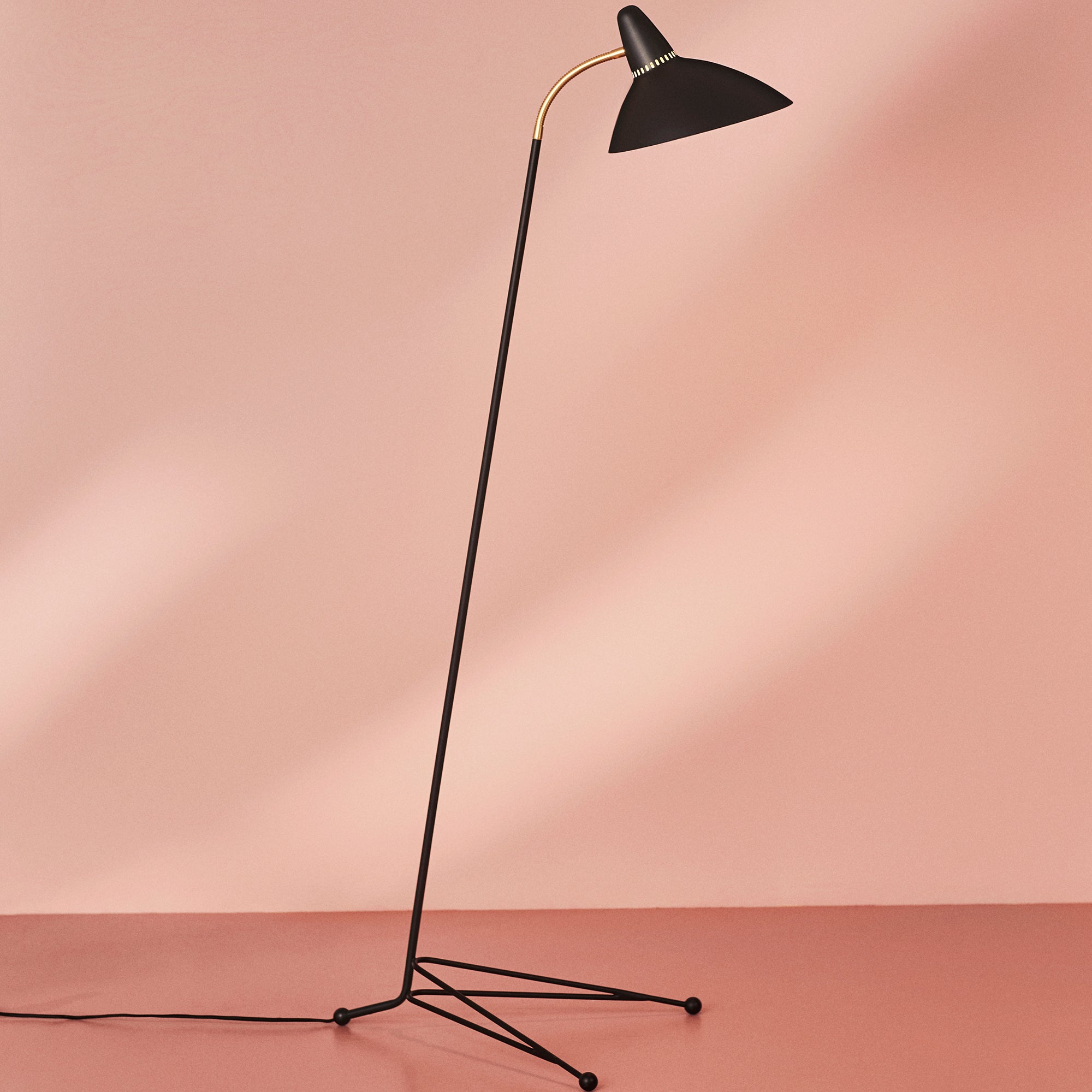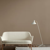 The Lightsome Floor Lamp features a wide, carefully shaped shade perched on a slender three-legged base. The lacquered metal shade includes signature light holes at the top, a hallmark of Holm-Sørensen's designs. Subtle brass details add to its distinctive character. Available in 3 classic colors, the lamp is finished in Warm Nordic's exclusive silk-matt lacquer for a refined and durable surface.