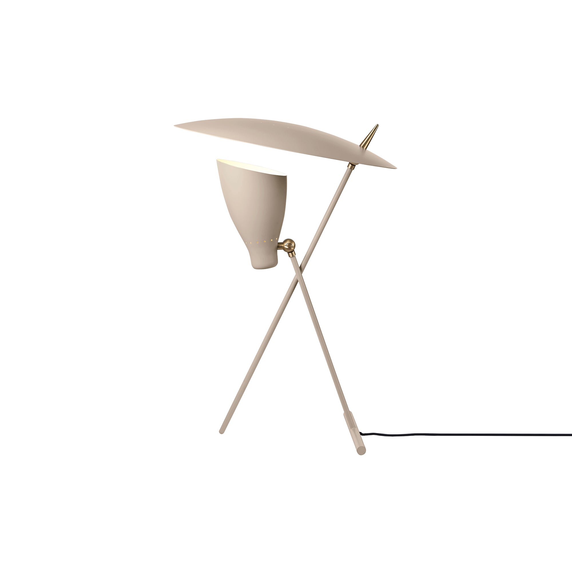 The Silhouette Table Lamp features an asymmetrical design with a reclining, slanted shade that reflects light from the upward-facing source against the wide metal shade, creating a soft, ambient glow. Crafted from lacquered steel with solid brass details, it is available in Pure Cashmere, Black Noir, and Warm White.