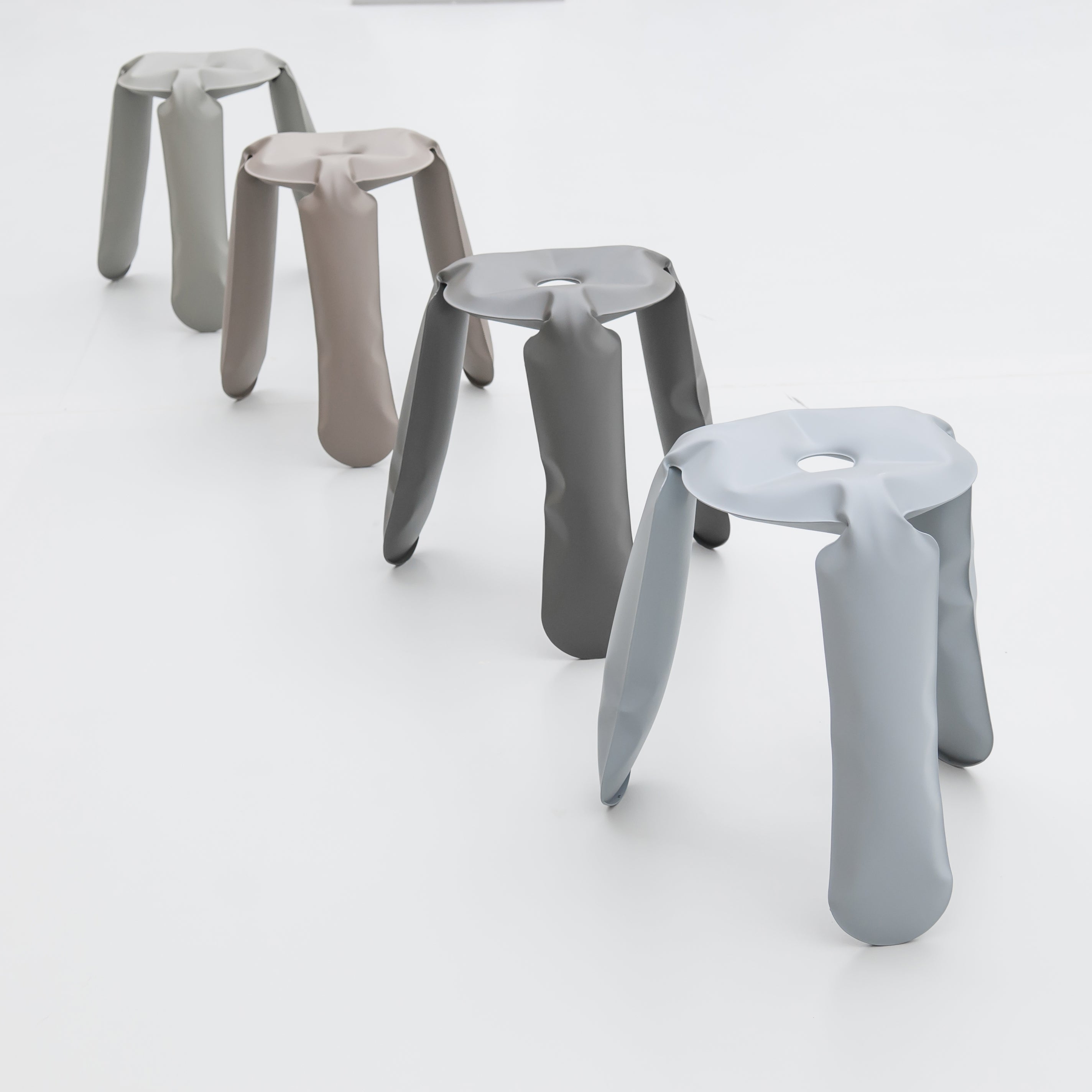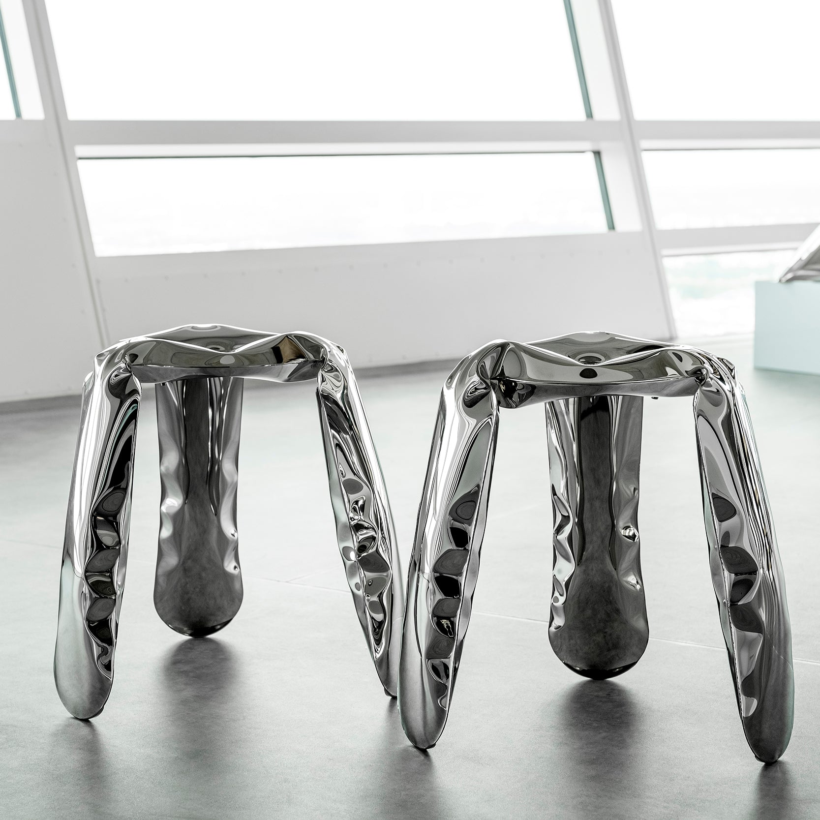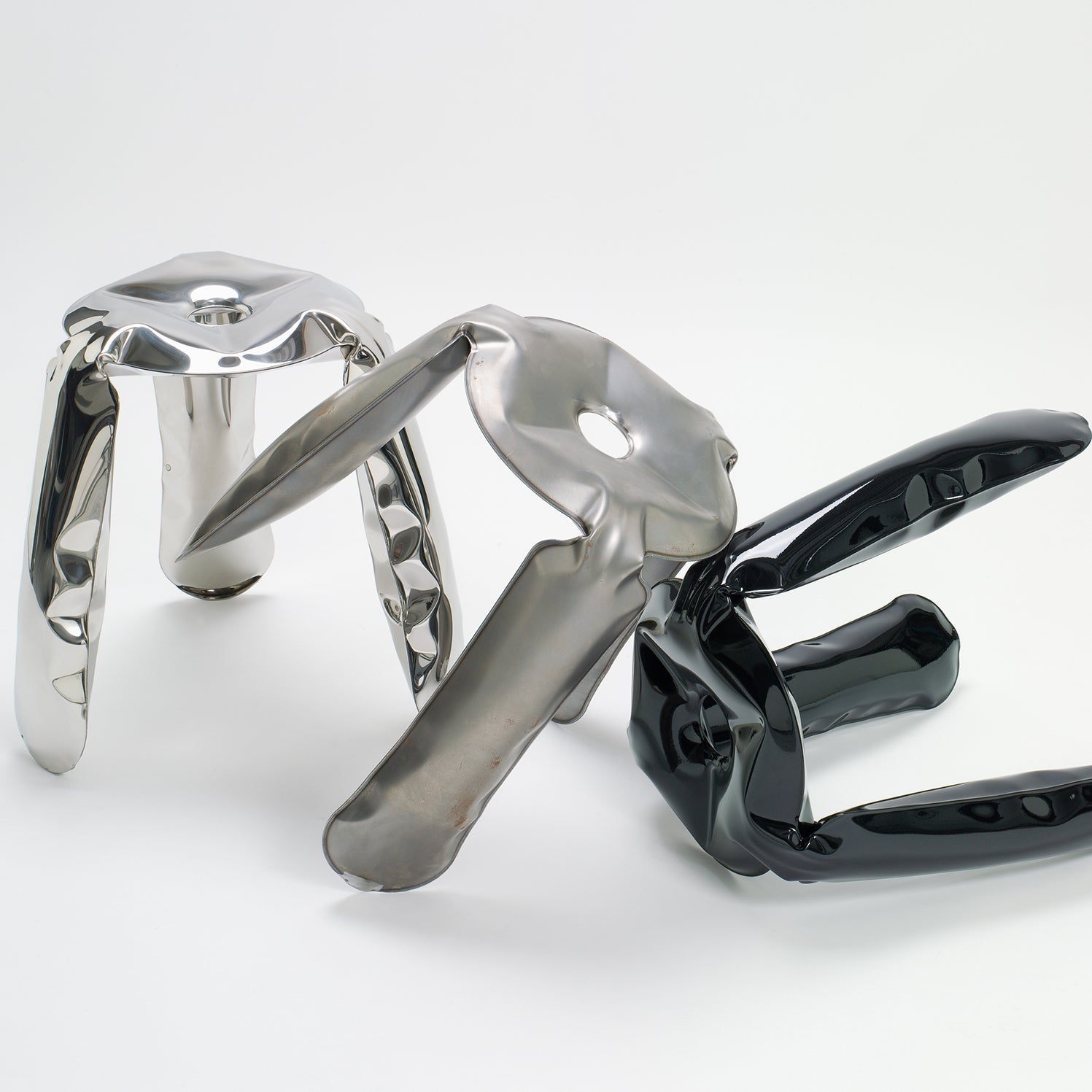 For sitting at the kitchen counter or just hanging out, this Plopp version is just the thing. A higher-seat variant on the head-turning original, the signature "swole" look is a result of the Zieta's astonishing FIDU process. Double sheets of very thin steel are inflated to 3D proportions under high air pressure. Lightweight, durable and, given the variables of the manufacturing technique, each one is fabulously one-of-a-kind.